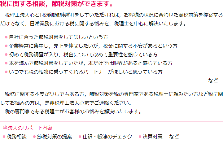 大変申し訳ございませんが,担当税理士の予定が一杯のため,現在, 税務顧問についてのご相談はお受けすることができません。