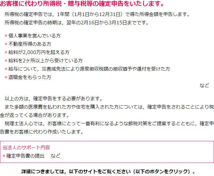 大変申し訳ございませんが、担当税理士の予定が一杯のため、現在、確定申告のご相談はお受けすることができません。※相続税申告のご相談はお受けしております。詳しくはこちらをご覧ください。